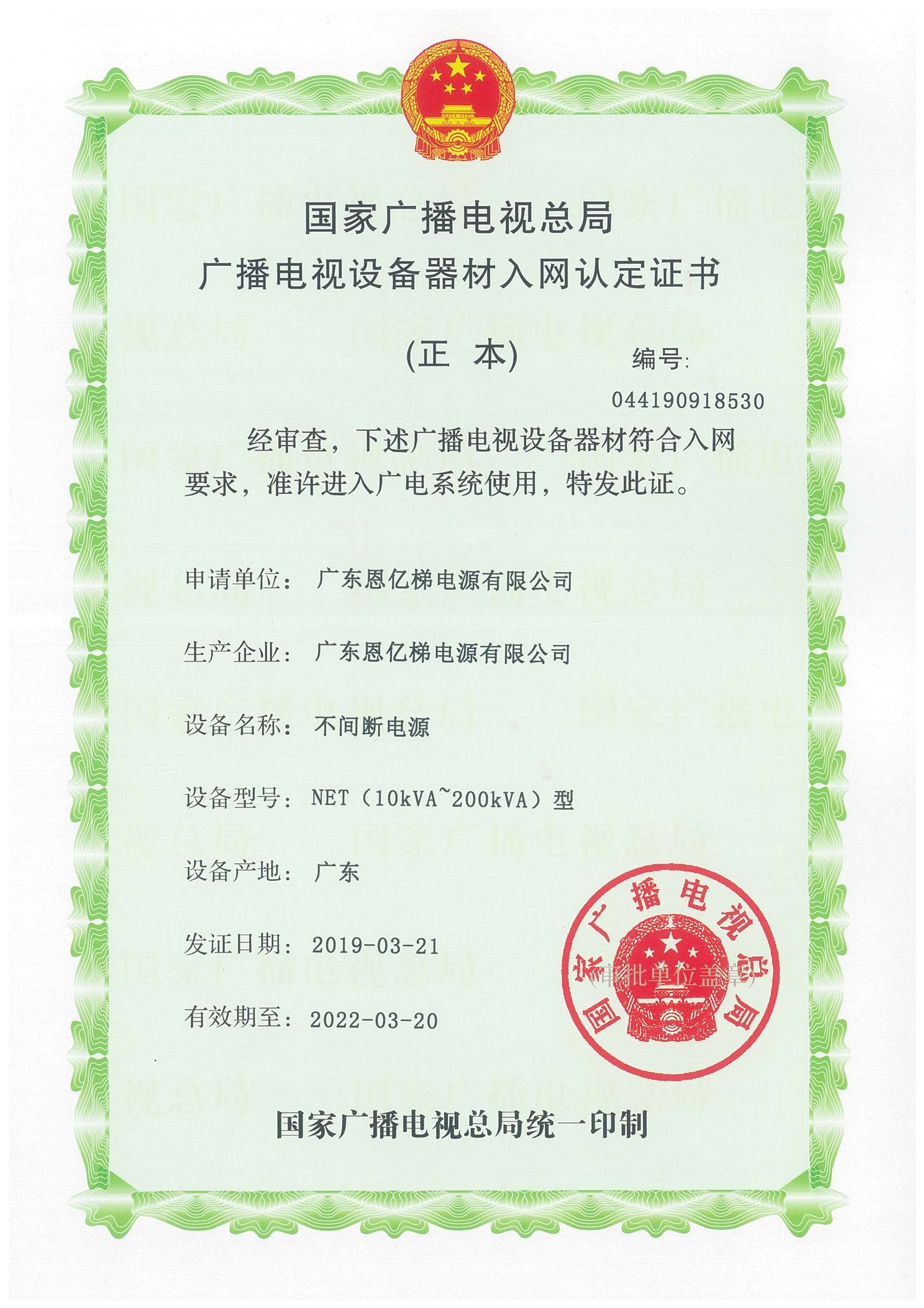 國家廣播電影電視總局入網(wǎng)認(rèn)定證書(交流穩(wěn)壓電源)