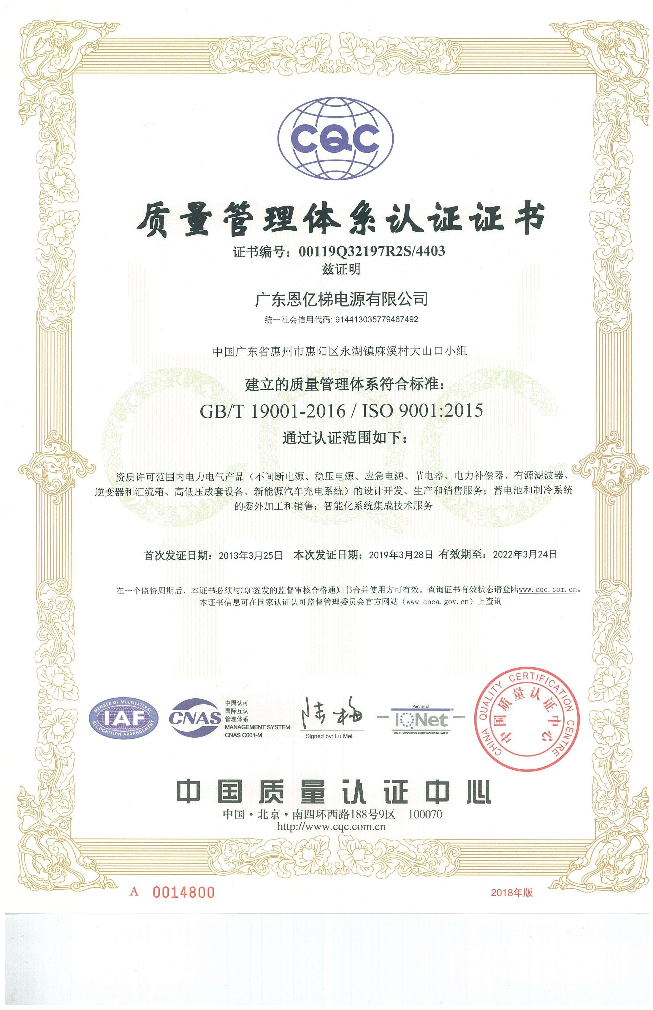 ISO9001質(zhì)量管理體系認證證書