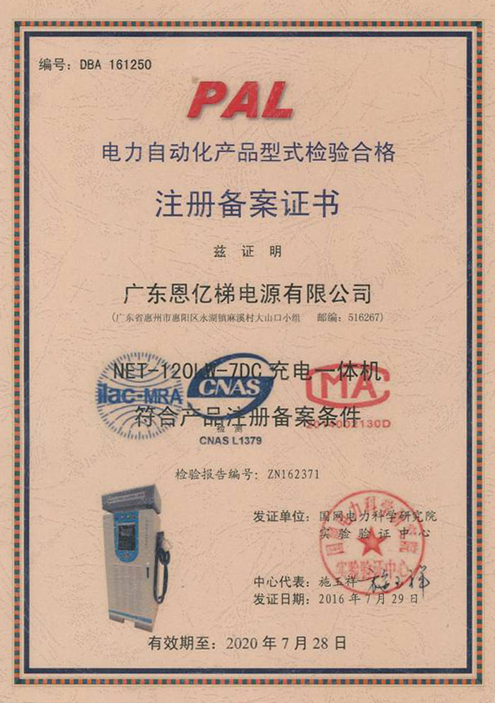 電力自動化產(chǎn)品型式檢驗合格注冊備案證書(充電一體機)